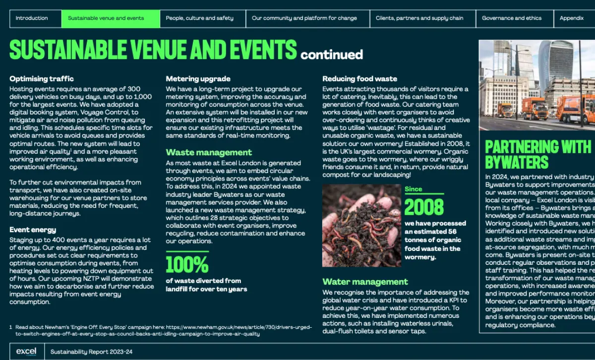 런던 EXCEL의 지속가능성은 현장에서 ‘폐기물 흐름’을 바꾸는 인프라가 대표적이에요. 케이터링에서 나온 음식물 폐기물을 전시장 내 웜어리(wormery🪱)로 보내 퇴비로 전환하고(2008년부터 운영), 이렇게 만들어진 퇴비를 조경에 다시 사용합니다. “줄이자”가 아니라, 버릴 게 생겨도 ‘버리는 단계’로 안 가게 만드는 구조인 거죠.