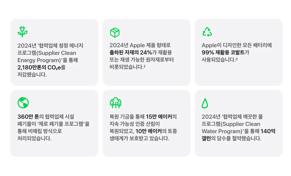 2024 환경진전보고서에서는 320개 이상의 협력사가 2030년까지 100% 재생에너지 사용에 동의했고, 이들이 직접 제조 지출의 95%를 차지한다고 밝혔습니다. 또한 2024년 협력사들의 재생에너지 전환으로 2,180만 톤의 온실가스 배출을 줄였다는 수치도 함께 공개했습니다.