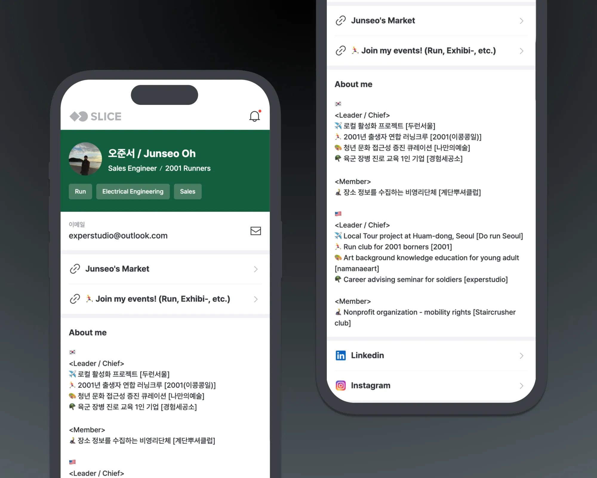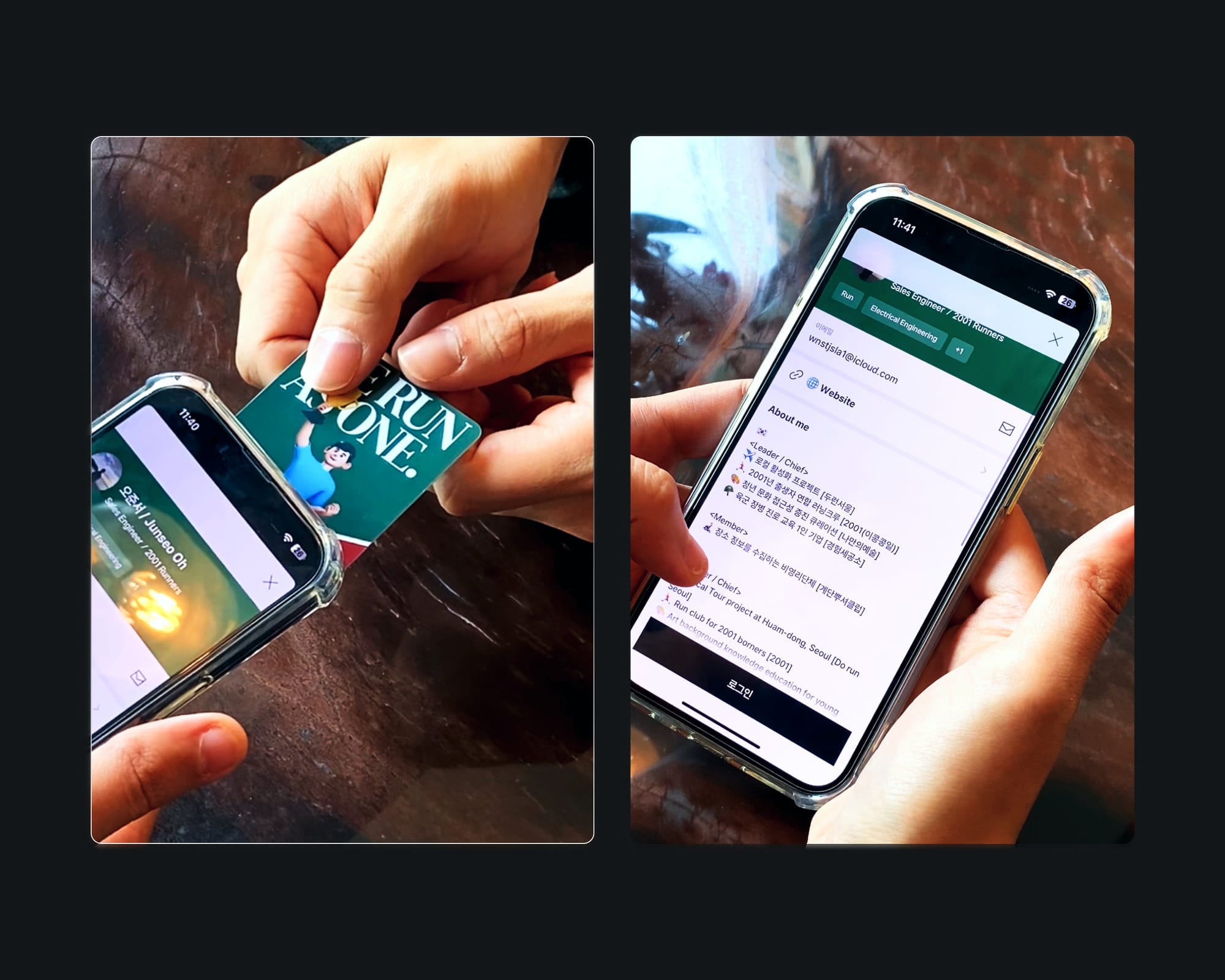 당시에는 창업에 관심이 있어서 창업 네트워킹 자리에 갔을 때 디지털 명함으로 소통을 했었고요. 최근에는 러닝 크루 회장을 맡게 되면서 크루가 다양한 분야에서 관심을 받다 보니 각 기업 담당자분들을 만날 기회가 많은데 그럴 땐 커스텀으로 만든 이 달리기 명함으로 공유하고 있습니다. 커피챗이 있을 때도 항상 NFC 명함을 사용해요.