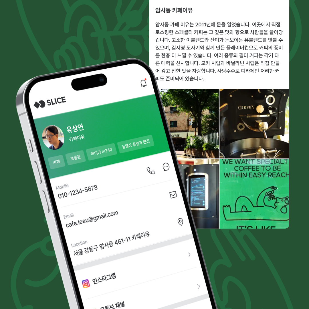 : 저는 하고 있는 일이 많다 보니 명함이 여러 장 필요했어요. 그런데 명함을 여러 장 만들어서 들고 다니기는 애매하잖아요. 그러다 인터넷 검색으로 디지털 명함 슬라이스를 발견했어요. NFC 카드나, QR 코드로 간단히 저희 정보를 공유할 수 있고, 뭔가 더 있어 보이는 느낌이 있어서 사용하게 됐어요. 손님들도 카드를 보여드리면 재미있어하시고, 처음 만나는 분과 인사할 때도 일반적인 명함보다 여러 관심사를 공유하기 좋은 거 같아요.