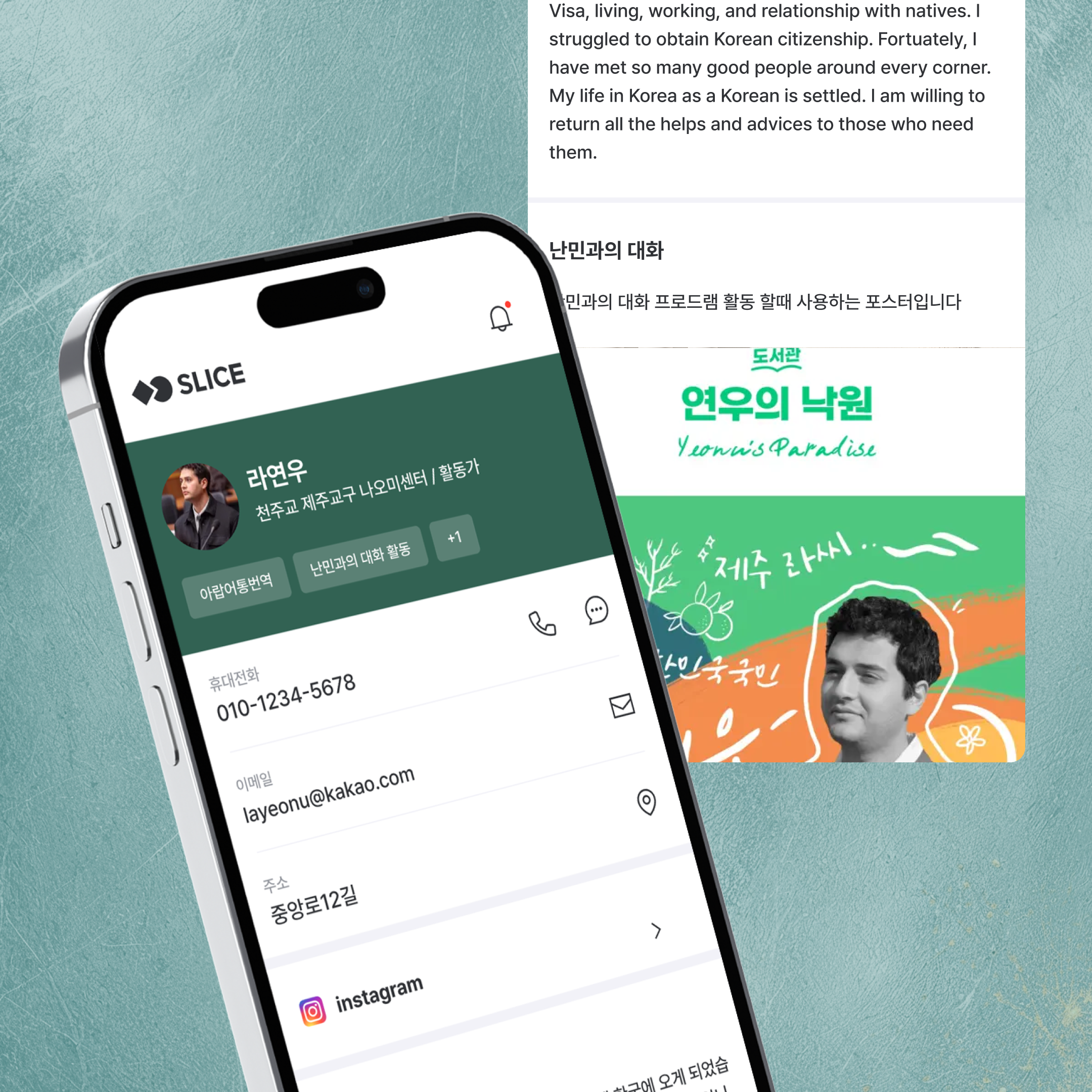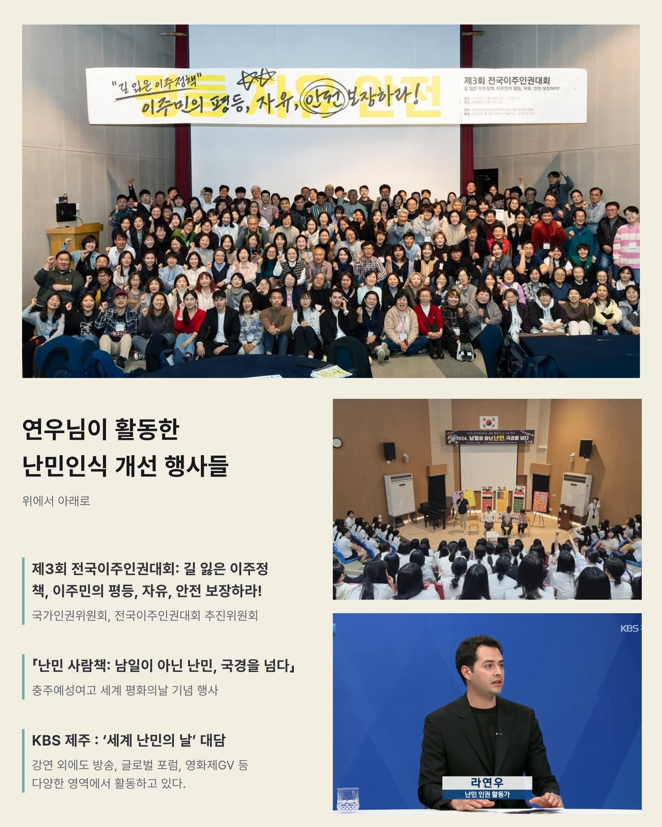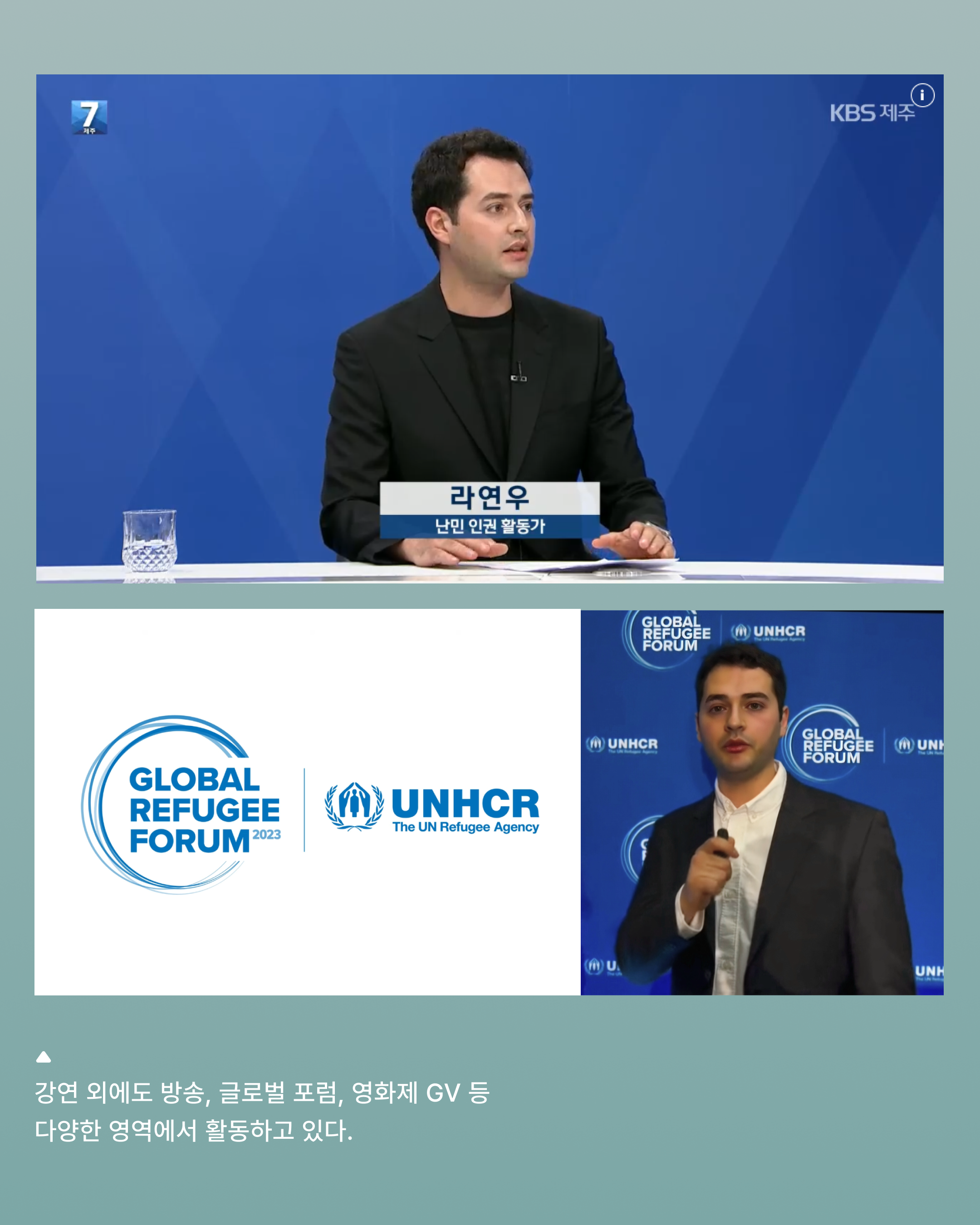 : 제 이름은 라연우이고요. 시리아에서 태어나 2012년에 한국으로 와서 난민으로 살다가 2020년에 귀화했어요. 지금은 천주교에서 운영하는 이주민 지원 센터에서 통역이나 상담을 주로 하고, 법무부 사회통합 프로그램 멘토단 강사 활동을 비롯해 이것저것 합니다.
