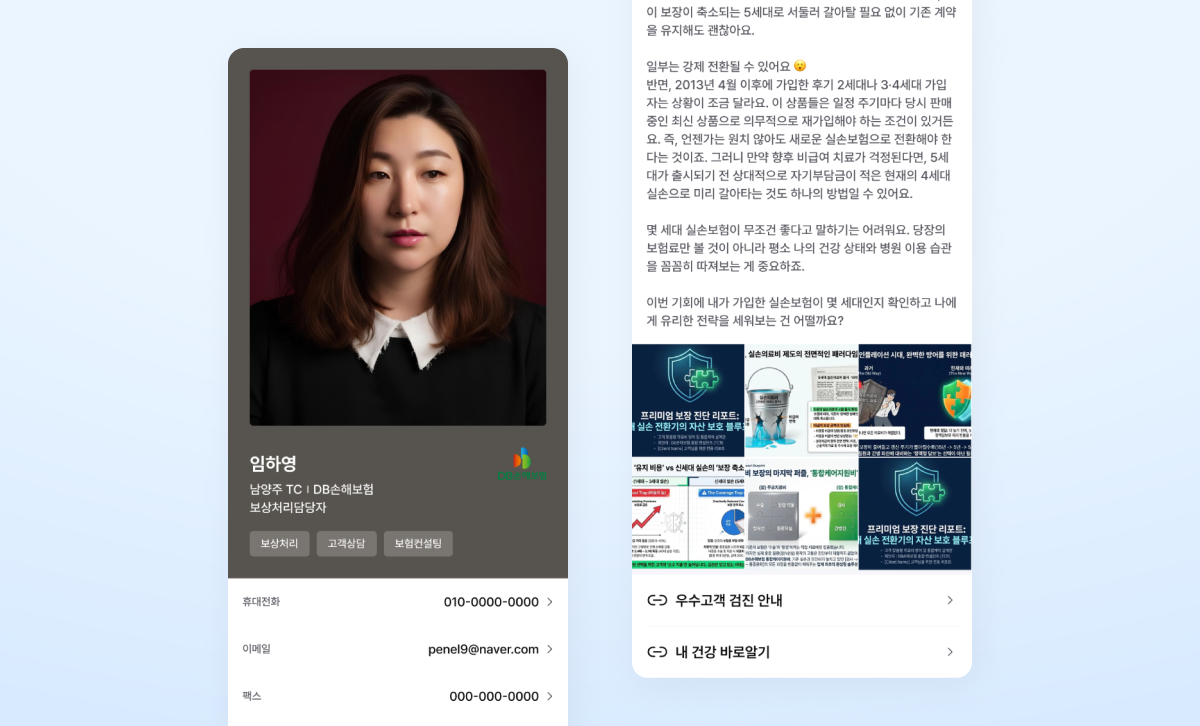 종이 명함은 거의 쓰지 않아요. 고객님께 서류 파일을 드릴 때 함께 끼워드리는 정도로만 사용하고, 그 외에는 전부 디지털 명함으로 전달해요. 디지털 명함을 단순한 연락처가 아니라 고객분들이 DB손해보험 서비스를 직접 활용하실 수 있도록 돕는 도구로 구성해뒀어요.