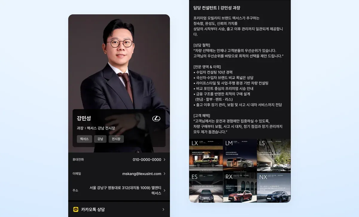 안녕하세요, 렉서스 강남 전시장에서 근무하고 있는 강민성 과장이라고 합니다. 수입차 브랜드 중 렉서스(Lexus)라는 자동차를 판매하는 세일즈 컨설턴트이고요, 차량 판매뿐만 아니라 운용 리스나 렌트를 통해 고객님들께 차량을 인도해 드리고 있습니다.