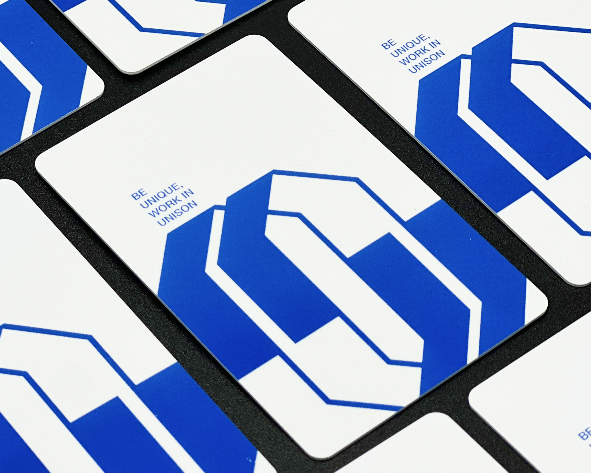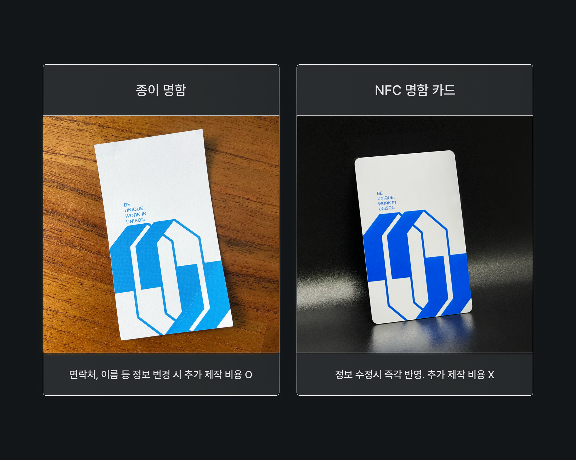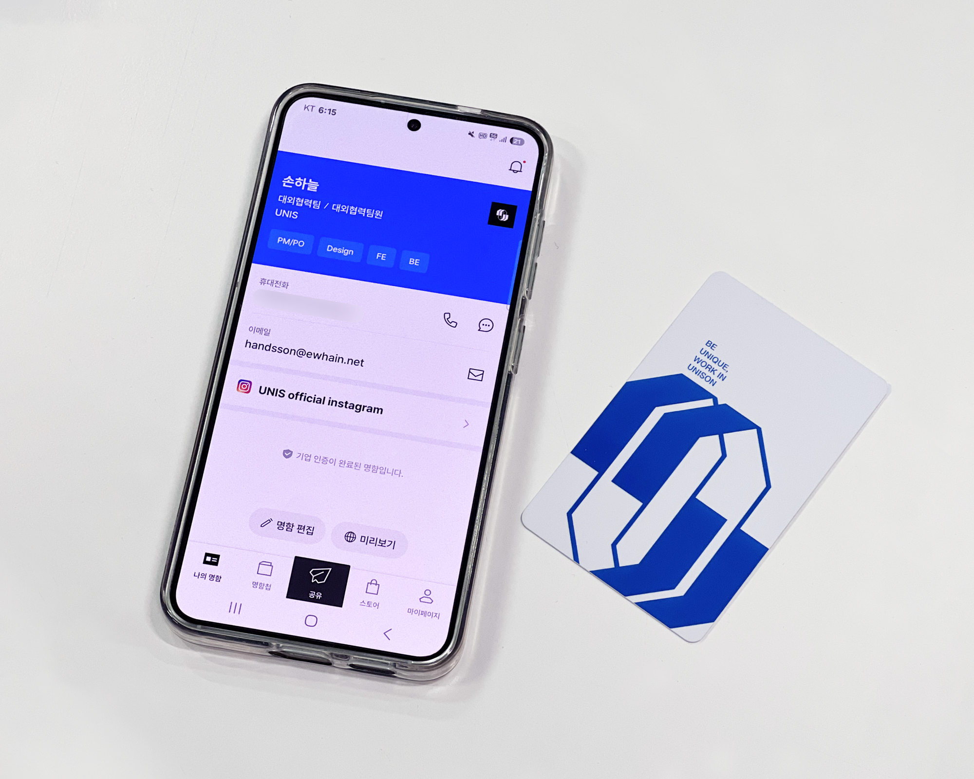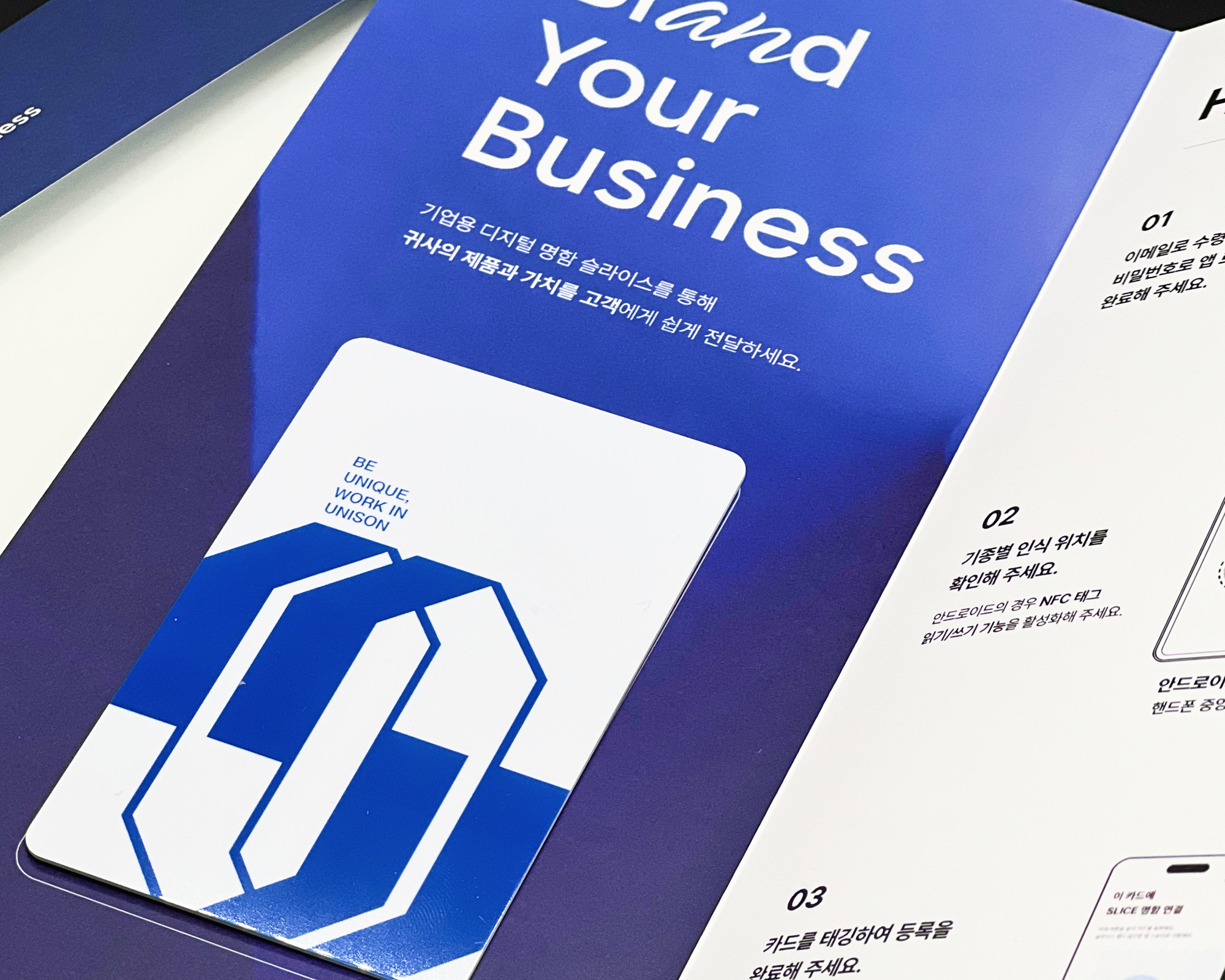 ✅ 유니스의 로고와 슬로건을 새긴 디자인의 NFC 카드로 유니스의 정체성이 돋보이도록 제작했어요.
