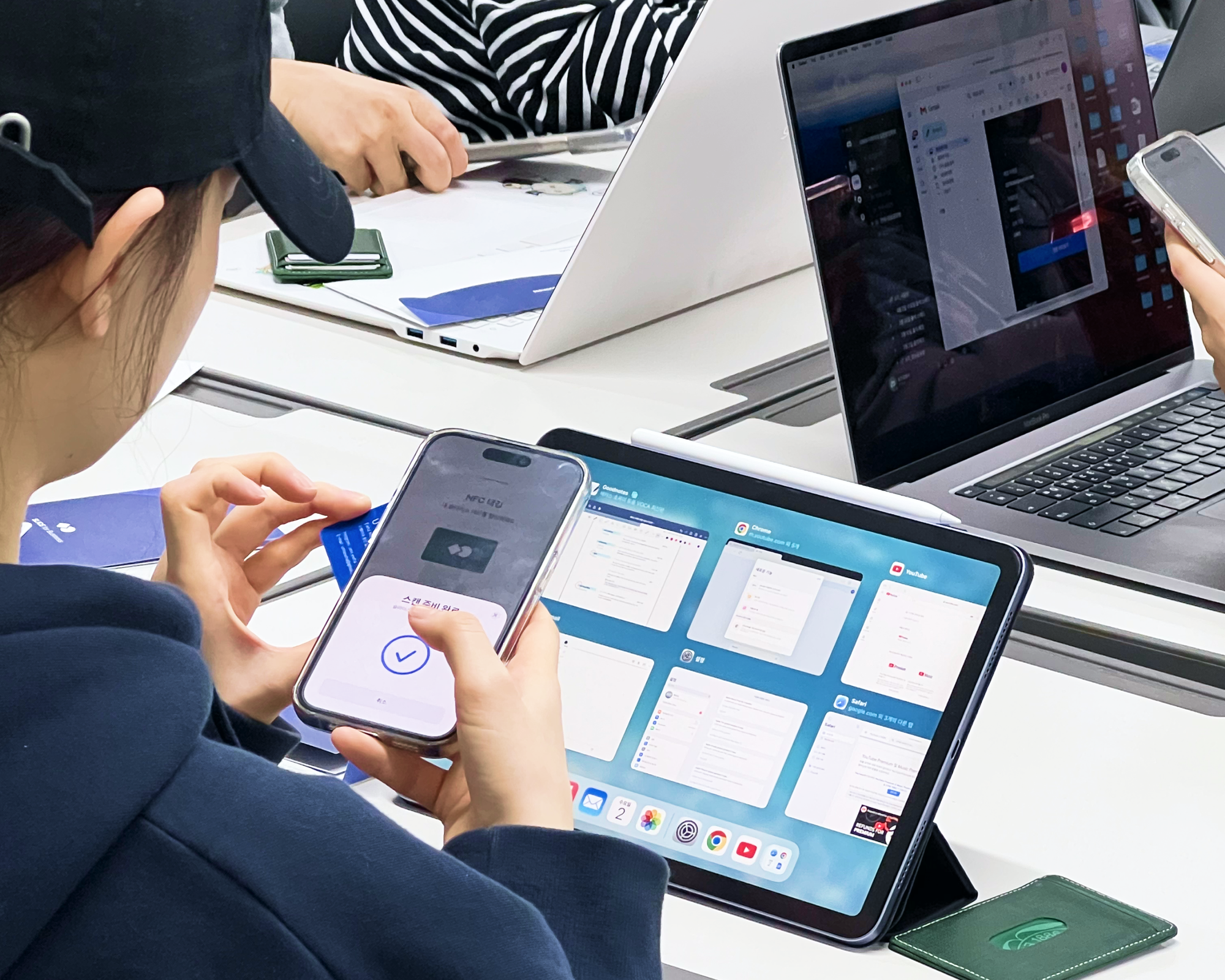 디지털명함 프로필을 만들고 있는 유니스 학회원(왼쪽)들과 디지털명함 인증사진(오른쪽)
