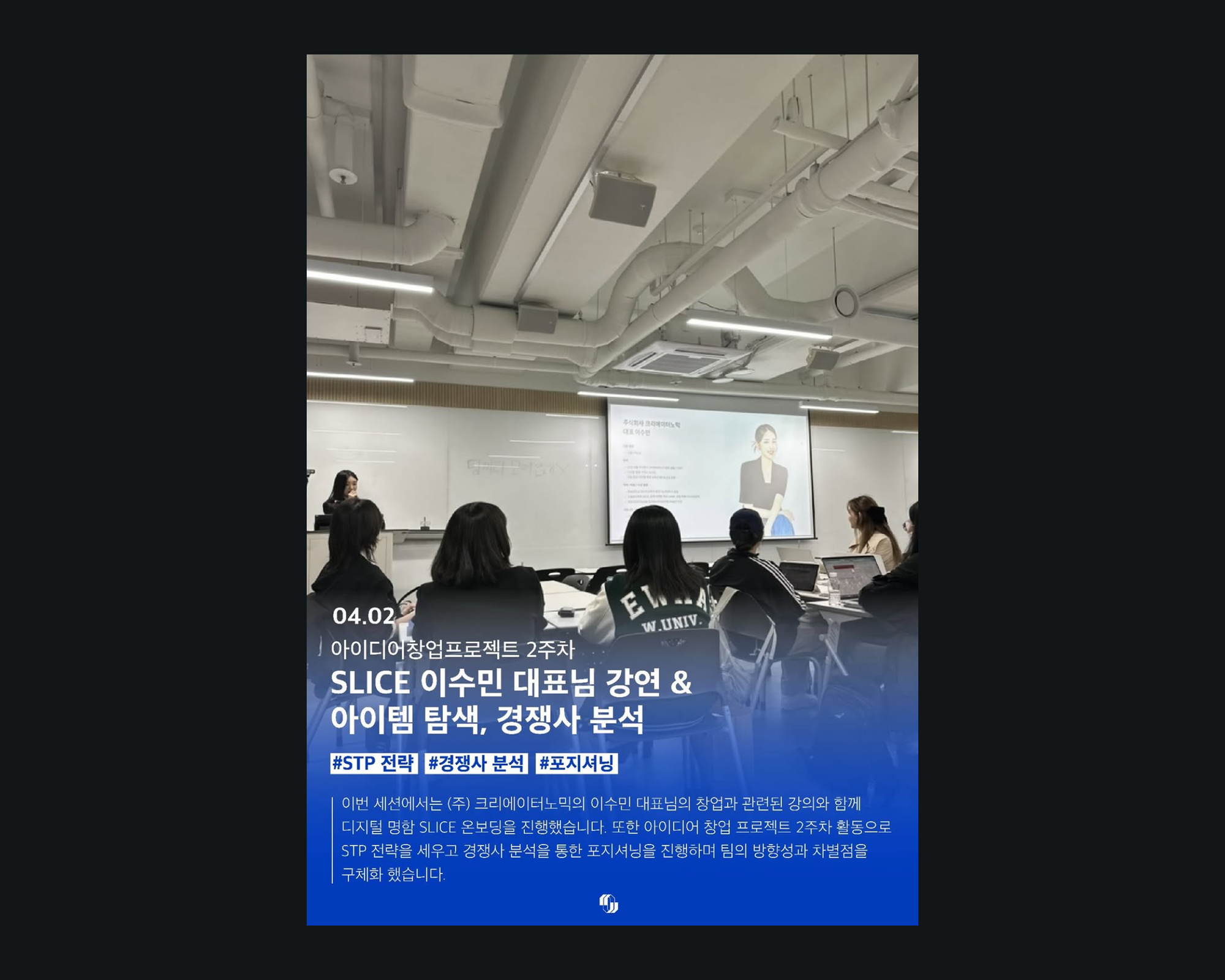 로고 변경뿐 아니라 네트워킹 행사도 지난 학기보다 횟수를 늘리고, 참여 대학과 인원도 확대하고 있습니다. 슬라이스를 만나면서는 자기 PR과 내부 네트워킹의 끈끈함까지 함께 강화하려고 노력 중입니다.