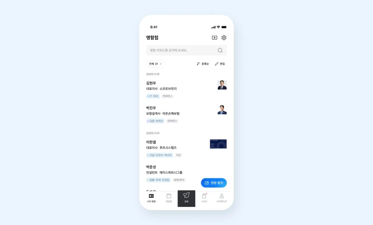 명함을 받은 직후 명함 관리 앱에 저장하세요. 30초만 투자하면 필요할 때 연락처를 바로 찾을 수 있어요.