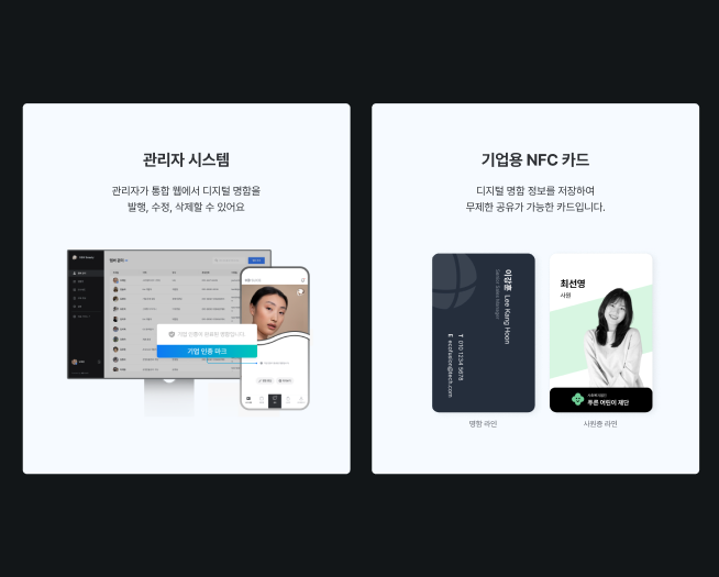 슬라이스에는 B2C 서비스 뿐만 아니라 기업 고객분들이 활용할 수 있는 기업용 디지털 명함 서비스도 있어요. 기업용 서비스는 관리자가 시스템을 통해 전사 디지털 명함을 통합 관리할 수 있는 구독형 서비스예요.