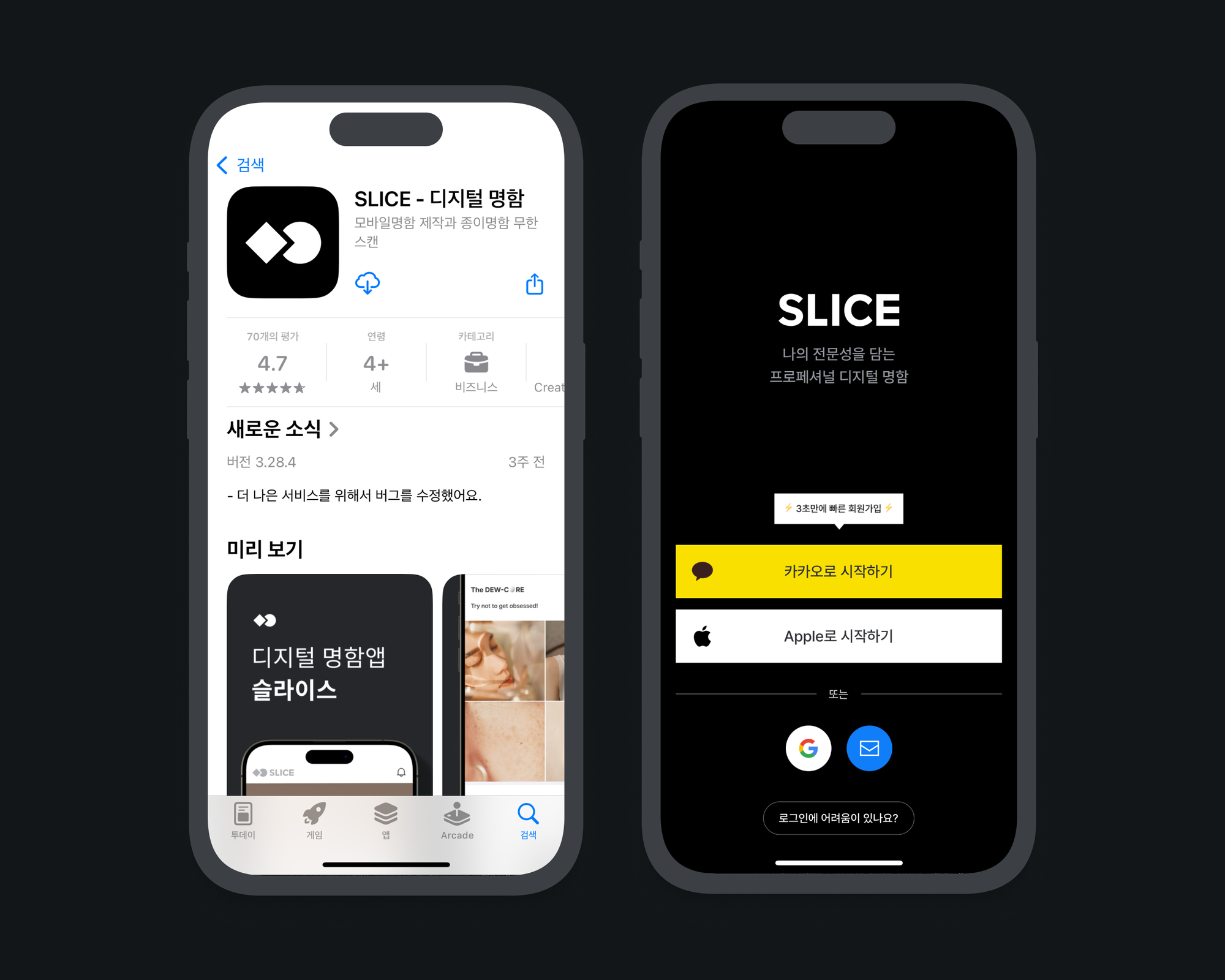 슬라이스 디지털명함은 앱만 다운받으면 누구나 무료로 제작할 수 있어요. 우선 앱스토어에서 '슬라이스'를 검색하고 앱을 다운로드 한 뒤, 회원가입을 진행하세요. 회원가입은 간단하고 빠르게 할 수 있어요. 이메일 주소와 비밀번호를 입력하거나, 카카오 계정을 연동하면 3초만에 가입 끝이에요.