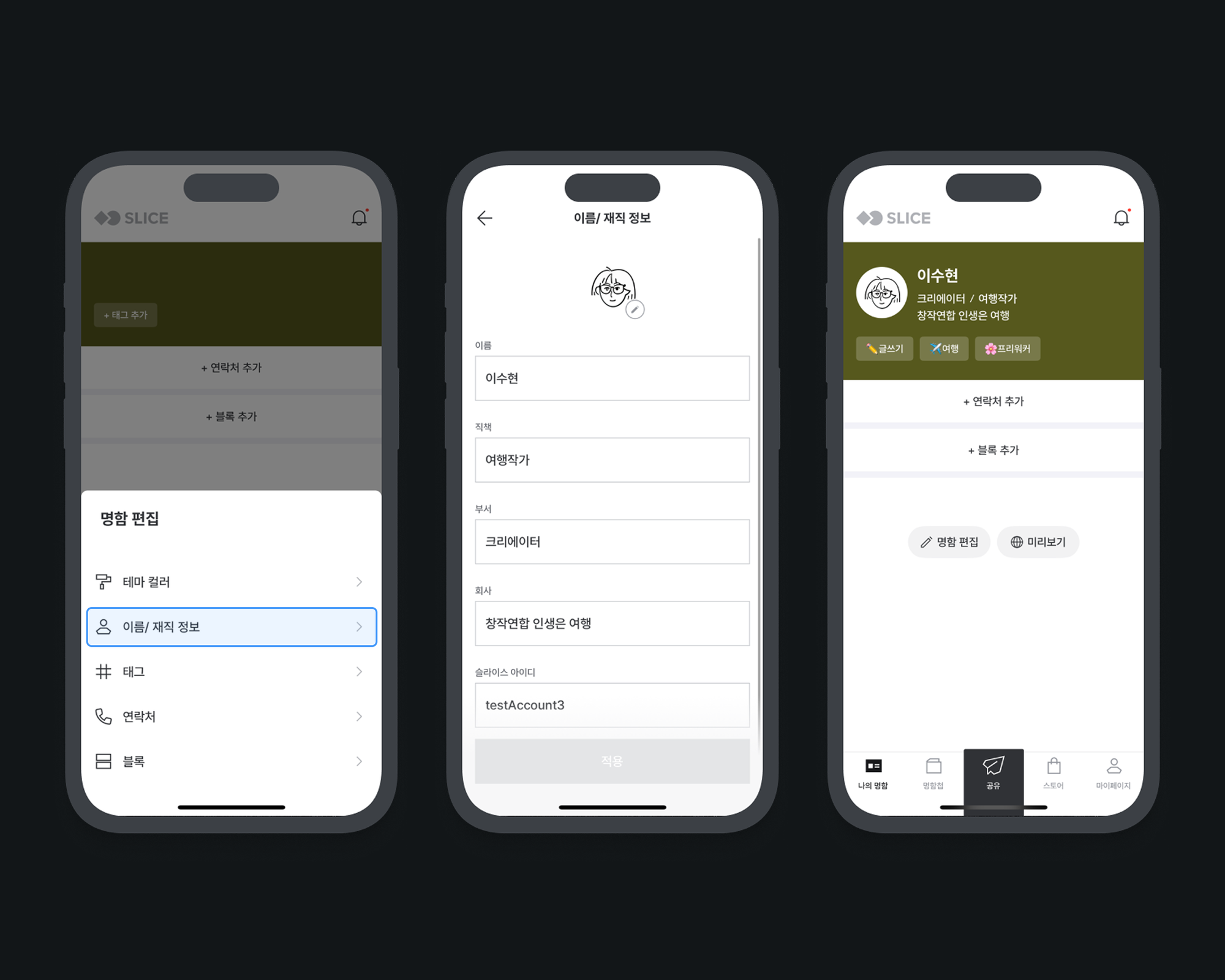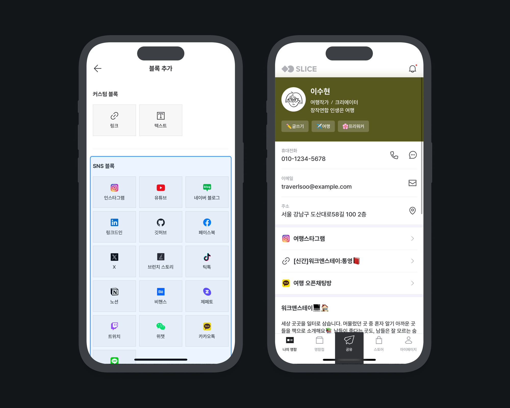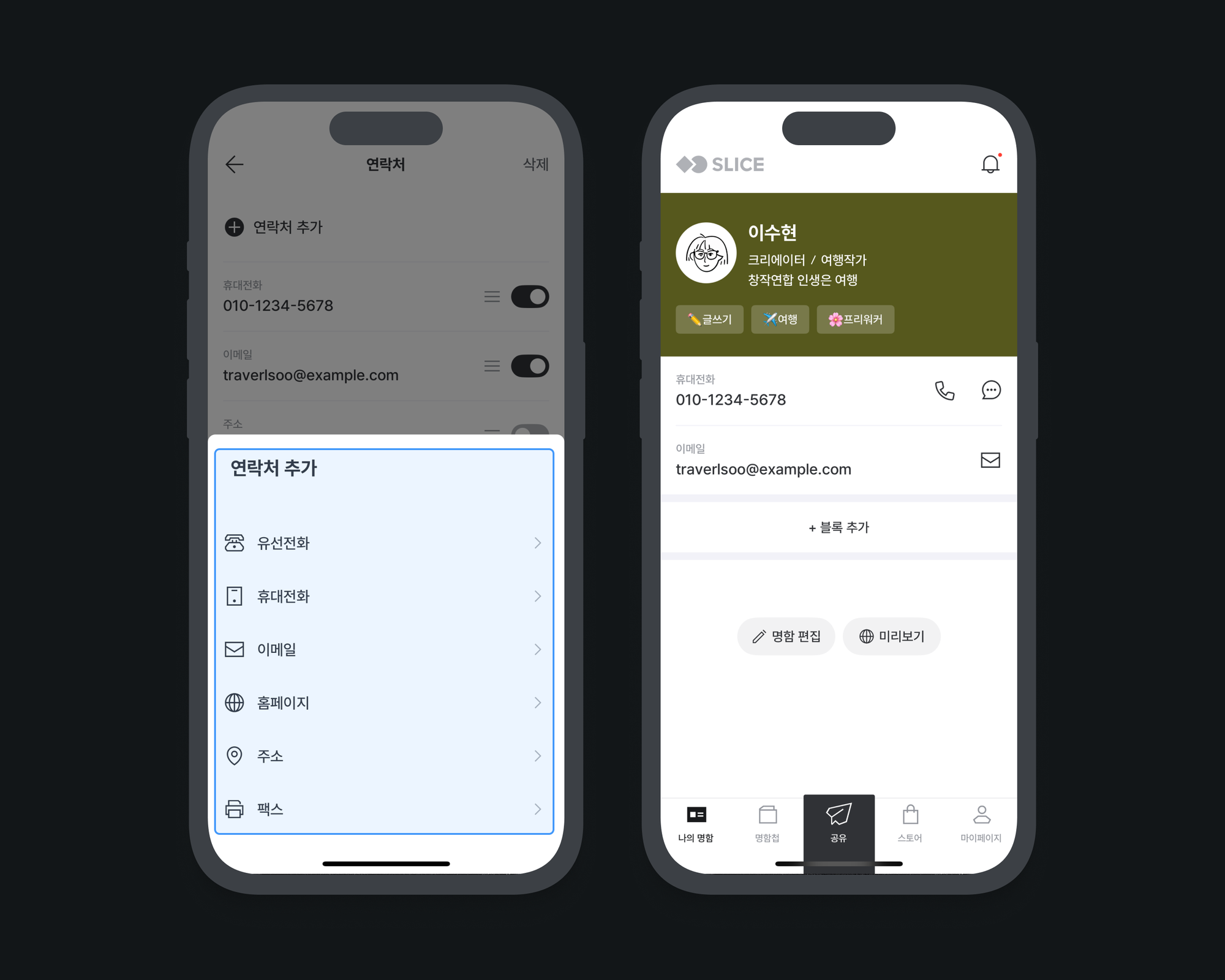 개인 고객용 명함부터 기업 고객용 명함까지, 명함을 만들면서 집중해야 하는 부분은 이 명함을 통해 '어떤 첫인상으로 각인되고 싶은가' 예요. 비즈니스가 성장하는데 꼭 필요한 첫인상 만들기, 슬라이스와 함께 하세요.