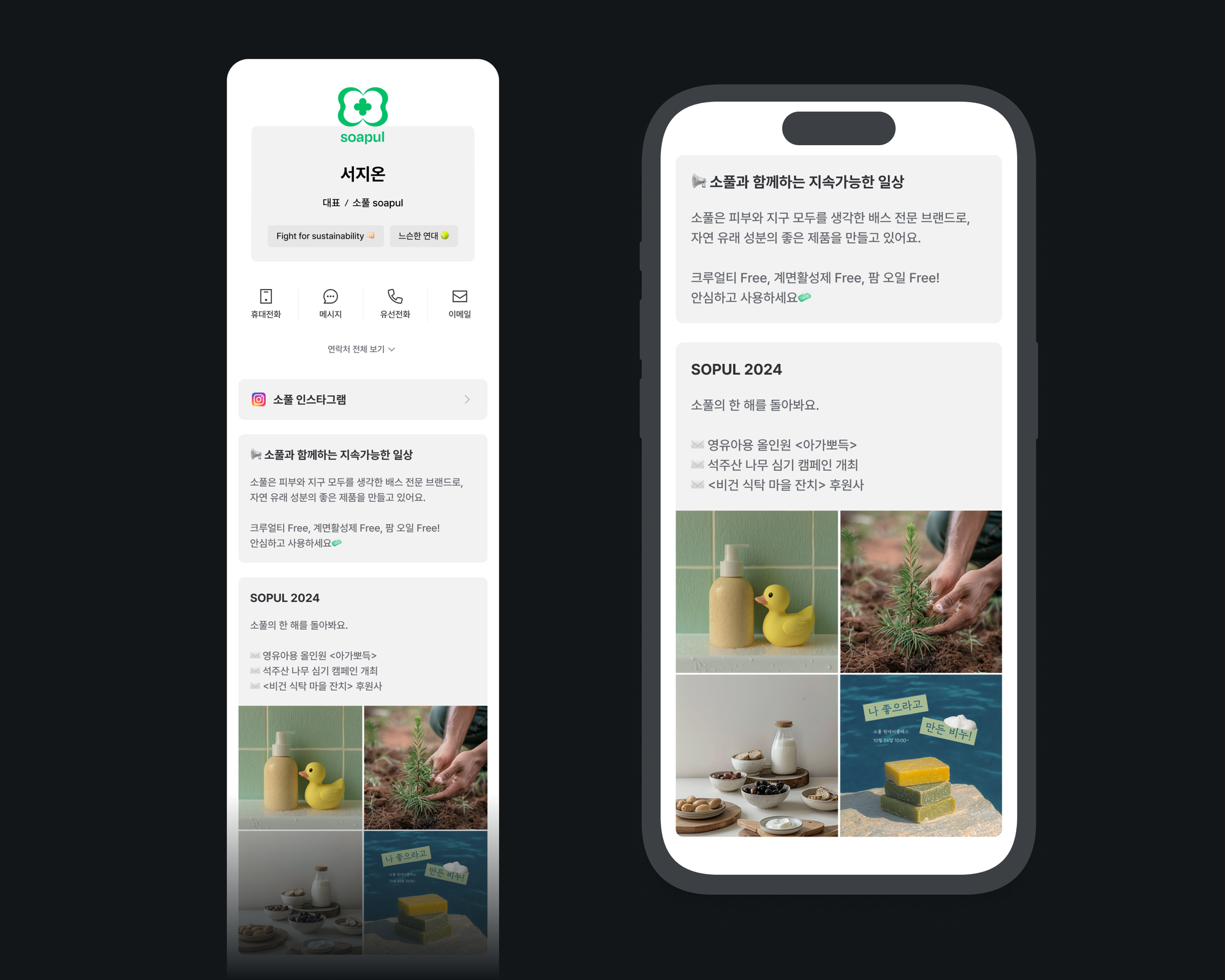 자기소개 또는 브랜드를 소개하는 단계예요. 프리랜서라면 간단한 자기소개와 이력을 추가해 보세요. 브랜드 대표님이나 기업 고객이라면 우리 회사의 브랜드 철학이나 서비스에 대한 소개를 넣어도 좋겠죠? 사람들이 명함을 보고 흥미를 느낄 수 있도록 시선을 끄는 사진과 함께 나만의 이야기를 들려주세요.