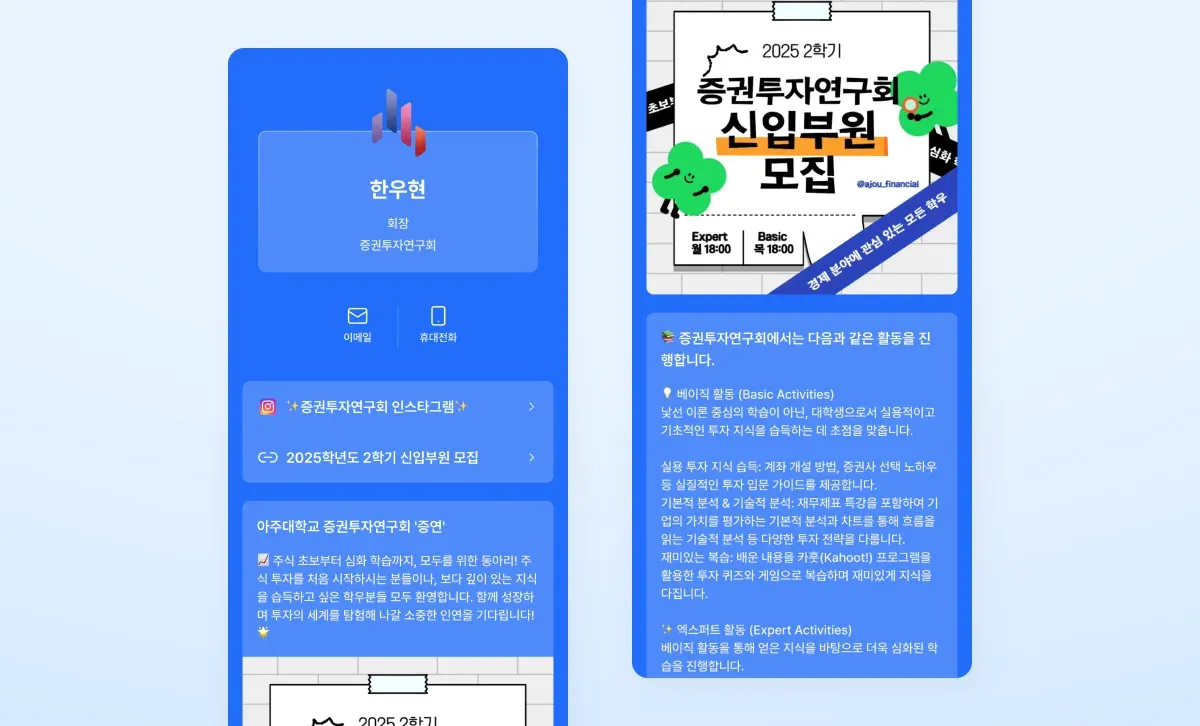 아주대학교 증권투자연구회도 비슷한 고민에서 출발했습니다. 학내외 행사와 네트워킹 자리가 많아질수록 학회를 소개할 방법이 필요했다고 하는데요, 이번 글에서는 증권투자연구회가 디지털 명함을 어떻게 활용하는지 살펴보겠습니다.