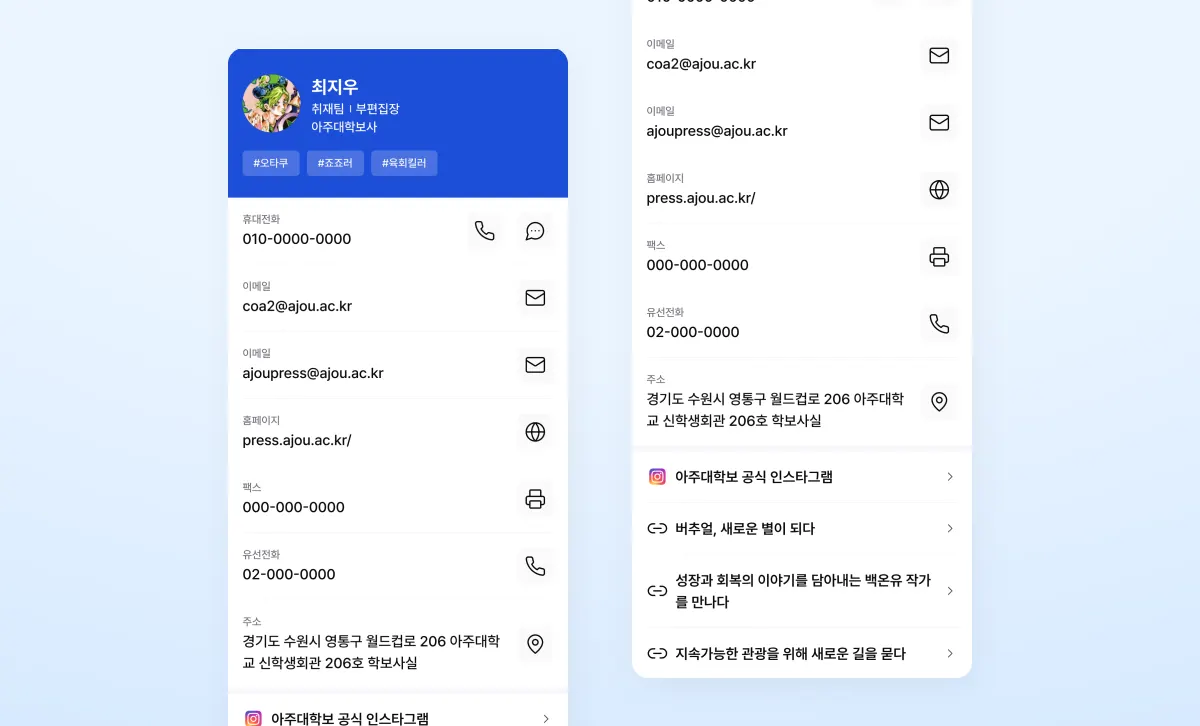 매 학기 50장씩 종이 명함을 사용하던 아주대학교 학보사는 슬라이스 명함을 도입한 뒤, 취재 현장에서 대화를 시작하는 방식이 이전과는 달라졌다고 말합니다. 실제 현장에서 어떤 변화가 있었는지 강준혁 편집장과 최지우 부편집장의 이야기를 들어봤습니다.