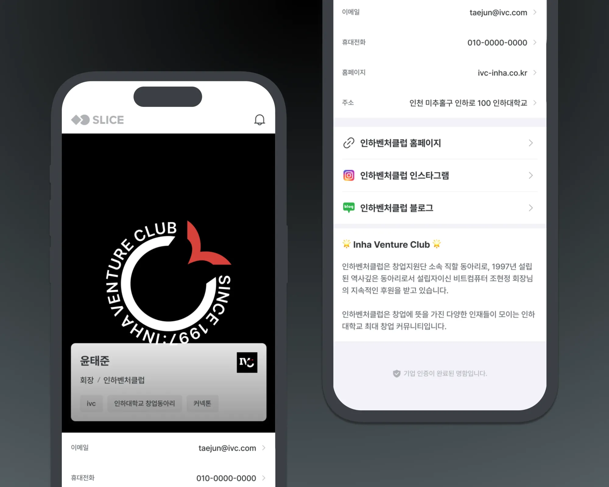 인하벤처클럽에서 만든 '디지털 명함'이 궁금하시다면, 슬라이스 서비스 소개서를 살펴보세요:) 디지털 명함으로 새로운 네트워킹 문화를 경험하고 있는 개인과 기업, 단체 활용 사례와 서비스에 대한 자세한 내용을 전달해 드릴게요!