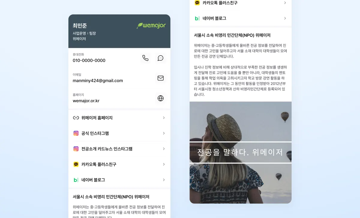 서울시 청소년 정책과 소속 비영리 단체 위메이저는 학교와 공공기관과의 소통이 잦은 만큼 명함 하나로 더 정돈되고 신뢰감 있는 첫인상을 만들어가고 있습니다. 공공기관과의 소통이 잦은 조직이라면 위메이저의 명함 활용법을 살펴보세요.