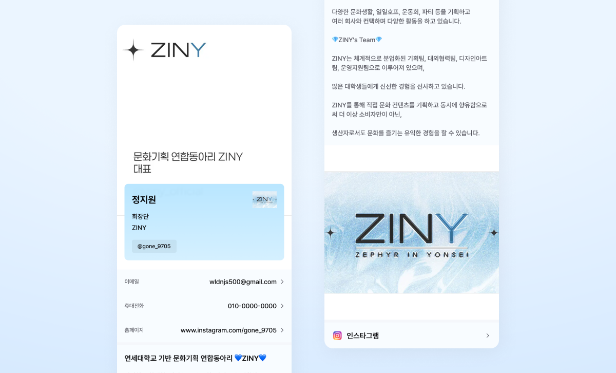 연세대학교 문화기획 연합동아리 지니ZINY 역시 함께 교류하는 9개의 동아리, 행사마다 컨택하는 브랜드들과의 네트워킹 과정에서 더 간편하고 인상적인 소개 방식의 필요성을 느꼈습니다. 제한된 시간에 보다 효과적으로 자신을 소개하고 싶다면 연세대학교 문화기획 동아리 지니가 디지털 명함을 어떻게 활용하고 있는지 함께 살펴보세요!