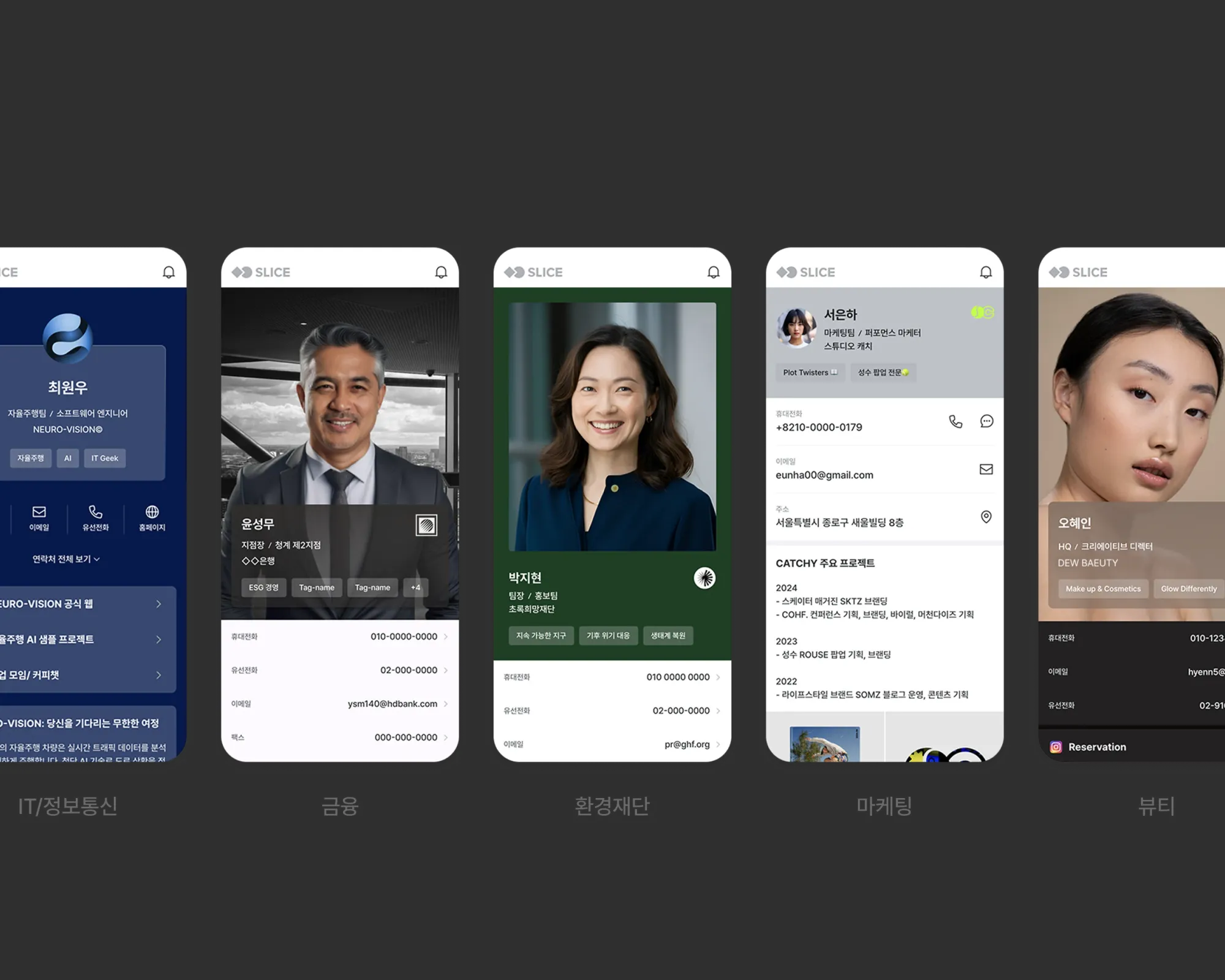 👉 종이 명함으로는 표현하기 어려운 기업 톤 앤 매너를 슬라이스는 템플릿과 디자인으로 담아냅니다.